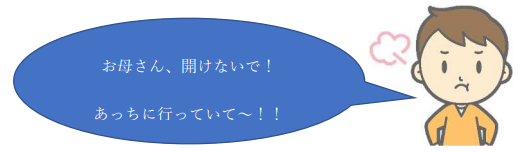 お⺟さんに向かって「開けないで! あっちに行っていて〜!!」と叫ぶ男の子の気持ちは、「今、うんちをしているから、誰にも邪魔されたくない〜!!」( ^ω^)・・・彼のプライバシーなのでしょう…。