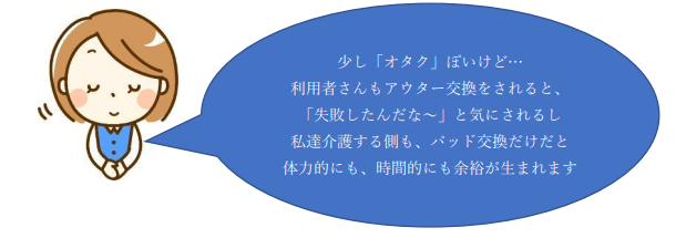私たちは、高品質なパッドが発売されてから、利用者さんの夜間安眠を考えて、基本的には、真夜中のおむつ交換を中止しています。