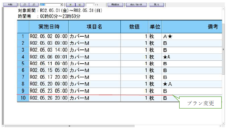 | プラン変更後のアセスメン<5 月25 日〜30 日> | 20 時交換1 回(14 時の排泄ケアの使用パッドからの汚染)でプラン変更後、5 時のカバー交換は、防げている |