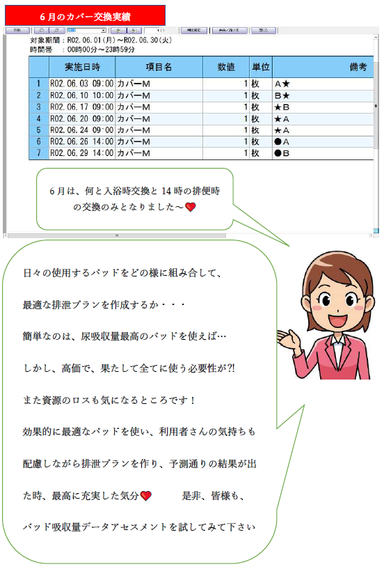 | カバーアセスメント<5 月1 日〜25 日> | 入浴時交換3 回、5 時2回 、9 時2 回、14 時1 回、20 時1回交換。強いて⾔えば、夜間〜早朝が時間傾向、多尿傾向である |