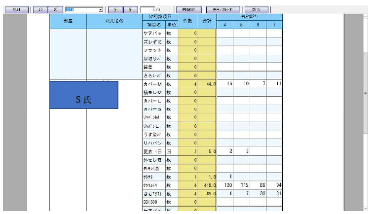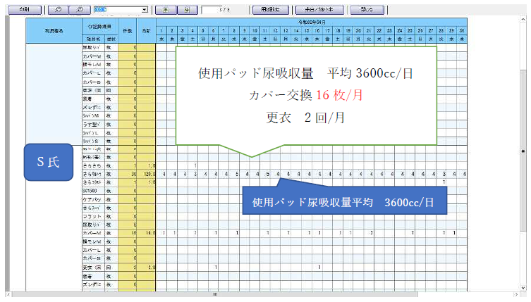 | 個々のコンピューター入力した情報データ | *個々のアウター使用時間・枚数 *個々の時間帯での使用パッドの種類の吸収量とのデータ分析 (小谷苑パッドデータ分析法) |