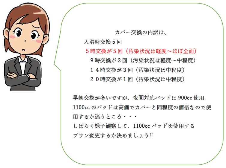 | カバーアセスメント<5 月1 日〜25 日> | 入浴時交換3 回、5 時2回 、9 時2 回、14 時1 回、20 時1回交換。強いて⾔えば、夜間〜早朝が時間傾向、多尿傾向である |