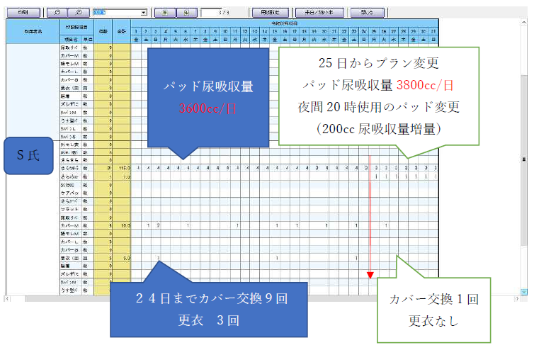 | プラン変更後のアセスメン<5 月25 日〜30 日> | 20 時交換1 回(14 時の排泄ケアの使用パッドからの汚染)でプラン変更後、5 時のカバー交換は、防げている |